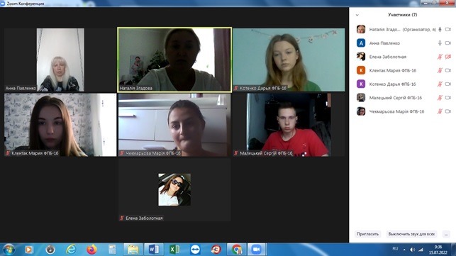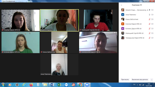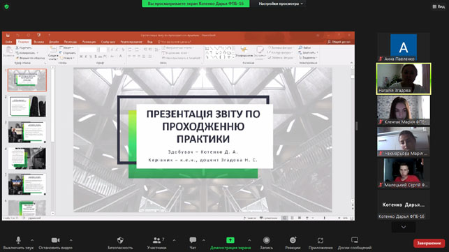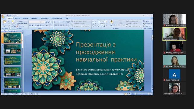 15.07.2022 року відбувся захист ознайомчої та комп’ютерної практики зі здобувачами 1 курсу спеціальності 051 Економіка ОПП Економічна та продовольча безпека. Були підготовленні звіти про проходження практики, ознайомчі презентації – де здобувачі представили результати свої роботи. Керівник практики к.е.н. Згадова Н.С., а також ведучі викладачі кафедри к.е.н. Заболотна О.С. та ст. викладач Павленко Г.М. заслухали доповіді здобувачів та виставили відповідні оцінки.