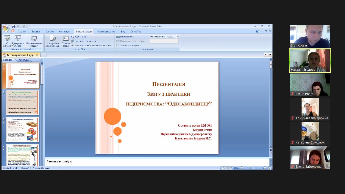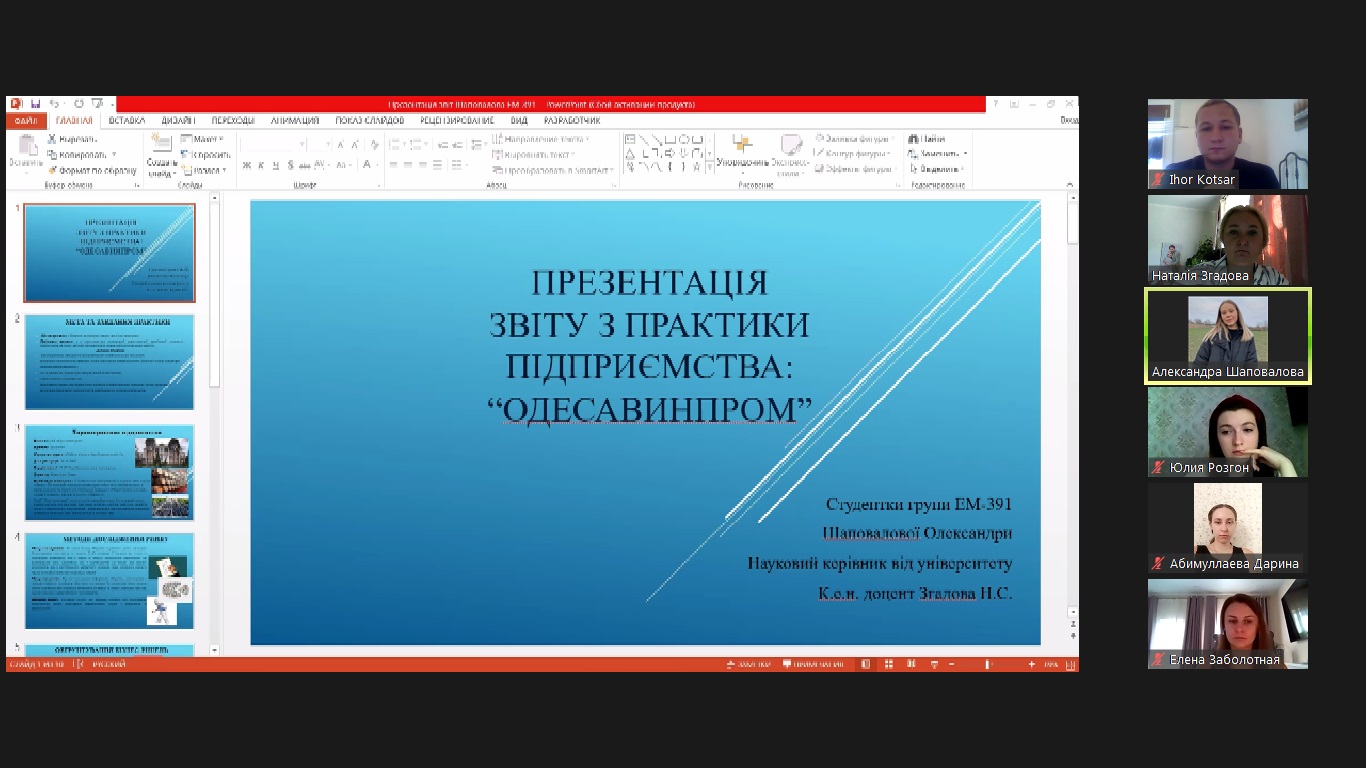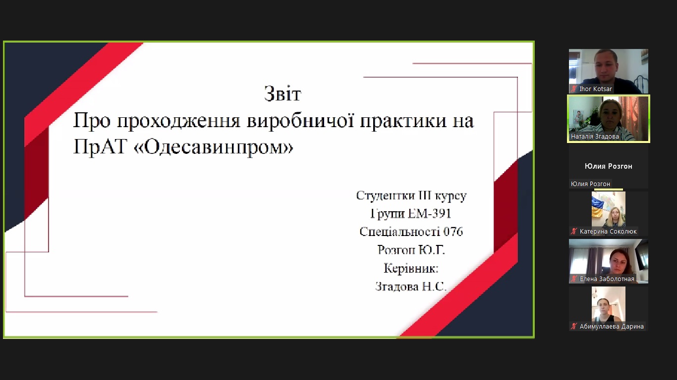 Проходження виробничої практики відбулося у терміни з 30.06.2022 р. по 27.07.2022 р. на базових підприємствах Одеси та Одеської області. Здобувачами групи ЕМ-391 були представлені звіти, щоденники та презентації по роботі на підприємстві. Захист практики приймали ведучі викладачі кафедри, доцент Згадова Н.С., доцент Соколюк К.Ю., доцент Заболотна О.С.