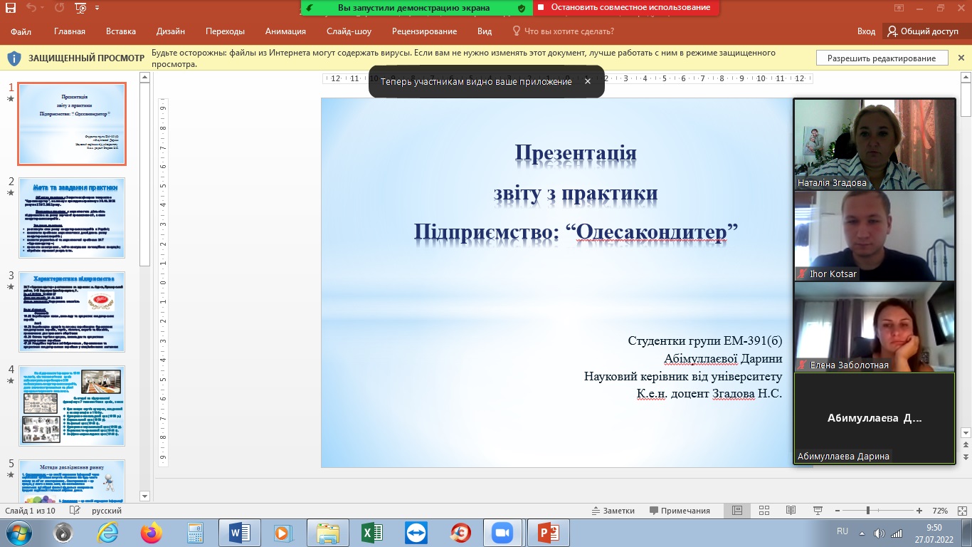 27.07.2022 на кафедрі ЕТтаФЕБ відбувся захист практики здобувачами освіти 3 курсу д.н., “Бакалавр” ЕБіК спец. 076 «Підприємництво, торгівля та біржова діяльність» за ОПП «Підприємництво у сфері виробництва, торгівлі та послуг».